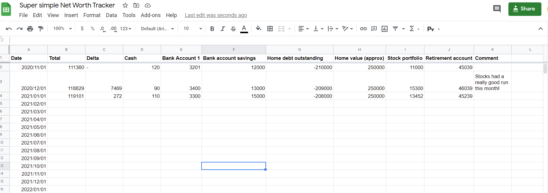 One tip I have for you that I haven’t seen mentioned anywhere else is to add a comment column to give yourself some context. For example if you move bigger amounts of money around or have some big expenses (e.g. home renovation). In a couple of months you might otherwise forget and have trouble understanding what happened to your finances back then.